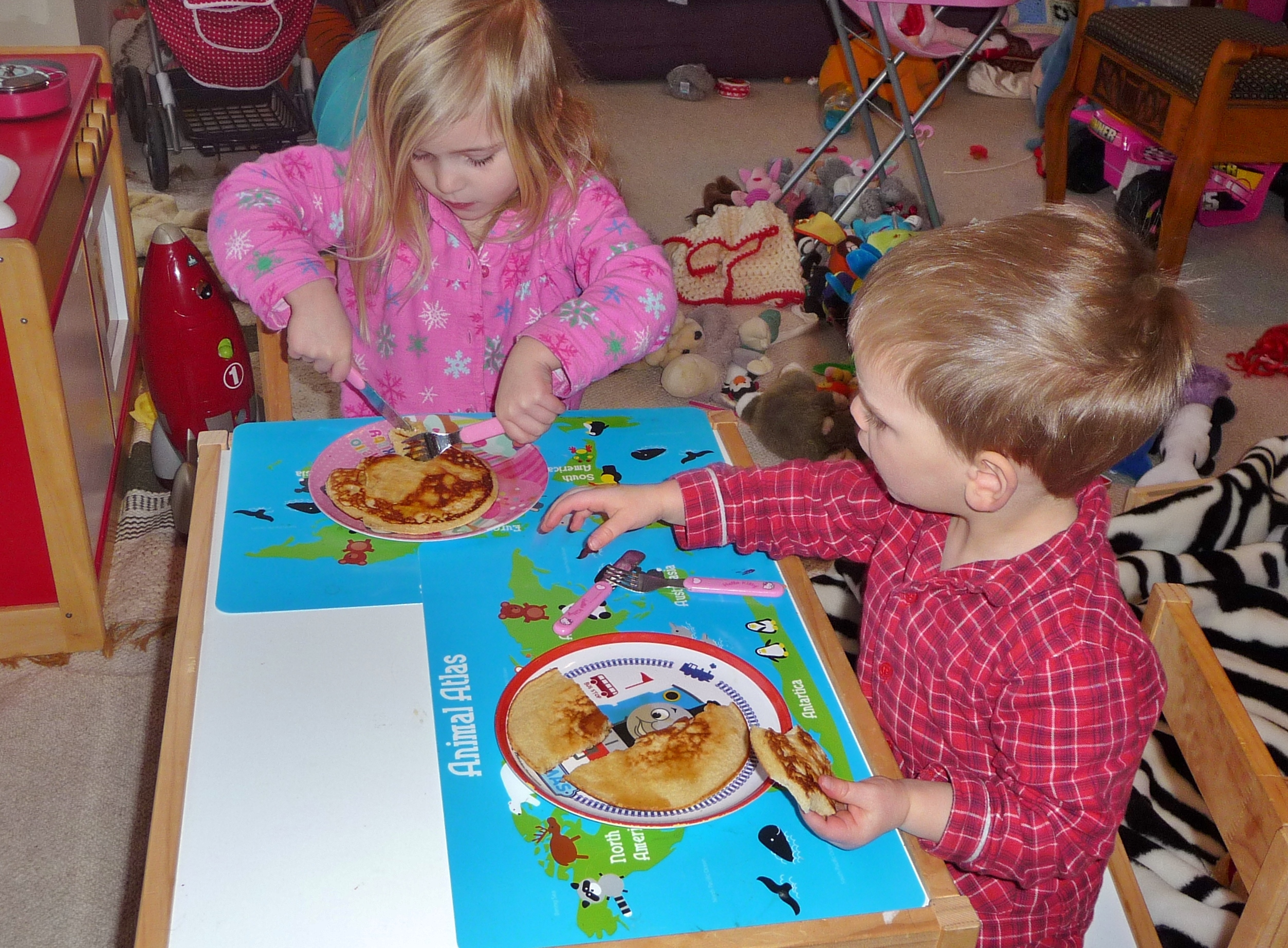 Pancakes is one of the plus points of hubbie being unemployed. When I need to get him out of bed early I make pancakes. I’ve discovered there isn’t much he won’t do for a couple of stodgy thick maple-syrup-soaked circles of batter. Suits me. They’re easy to make and they contain less sugar than the usual breakfast the kids have, even with the syrup.