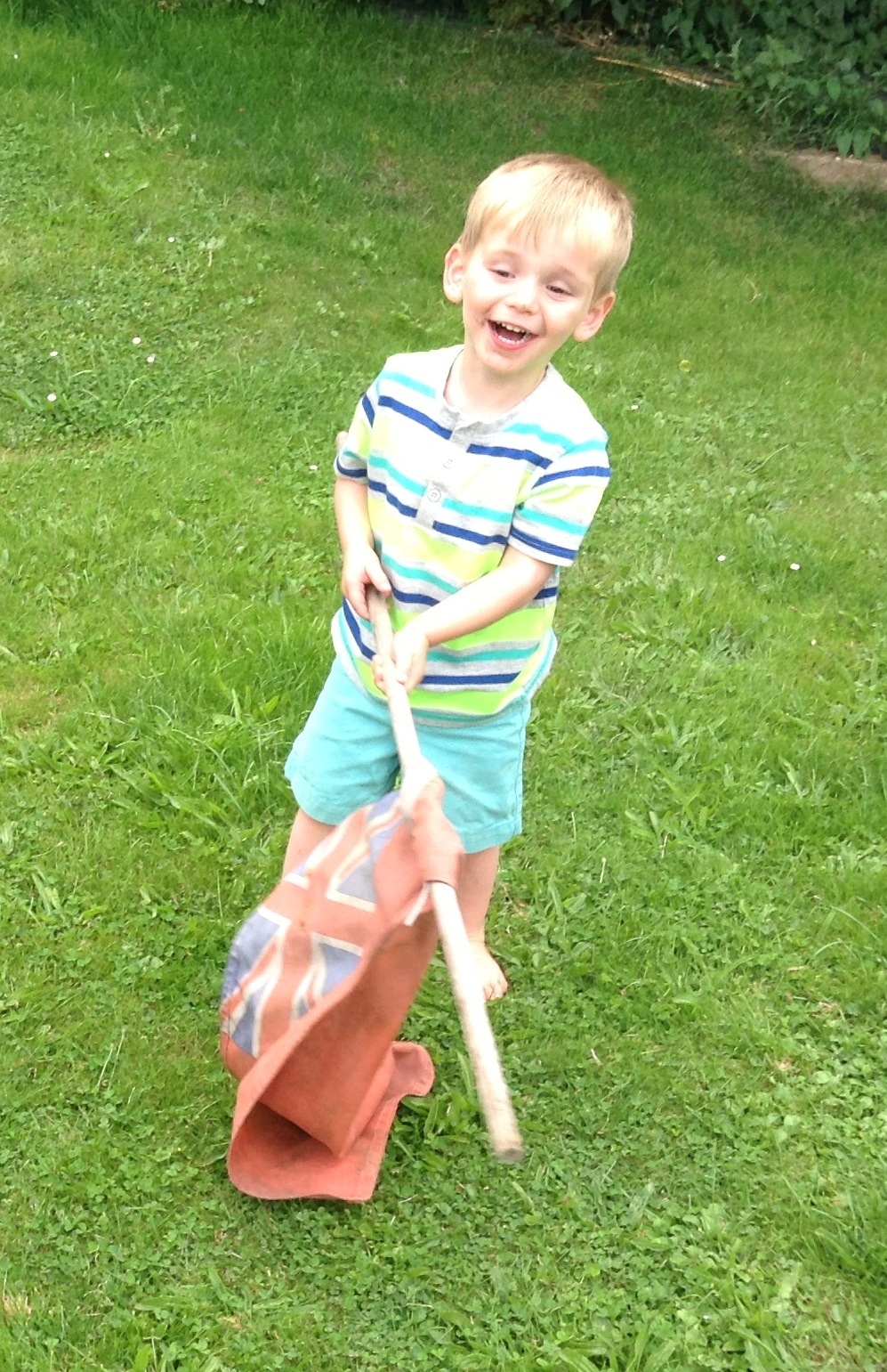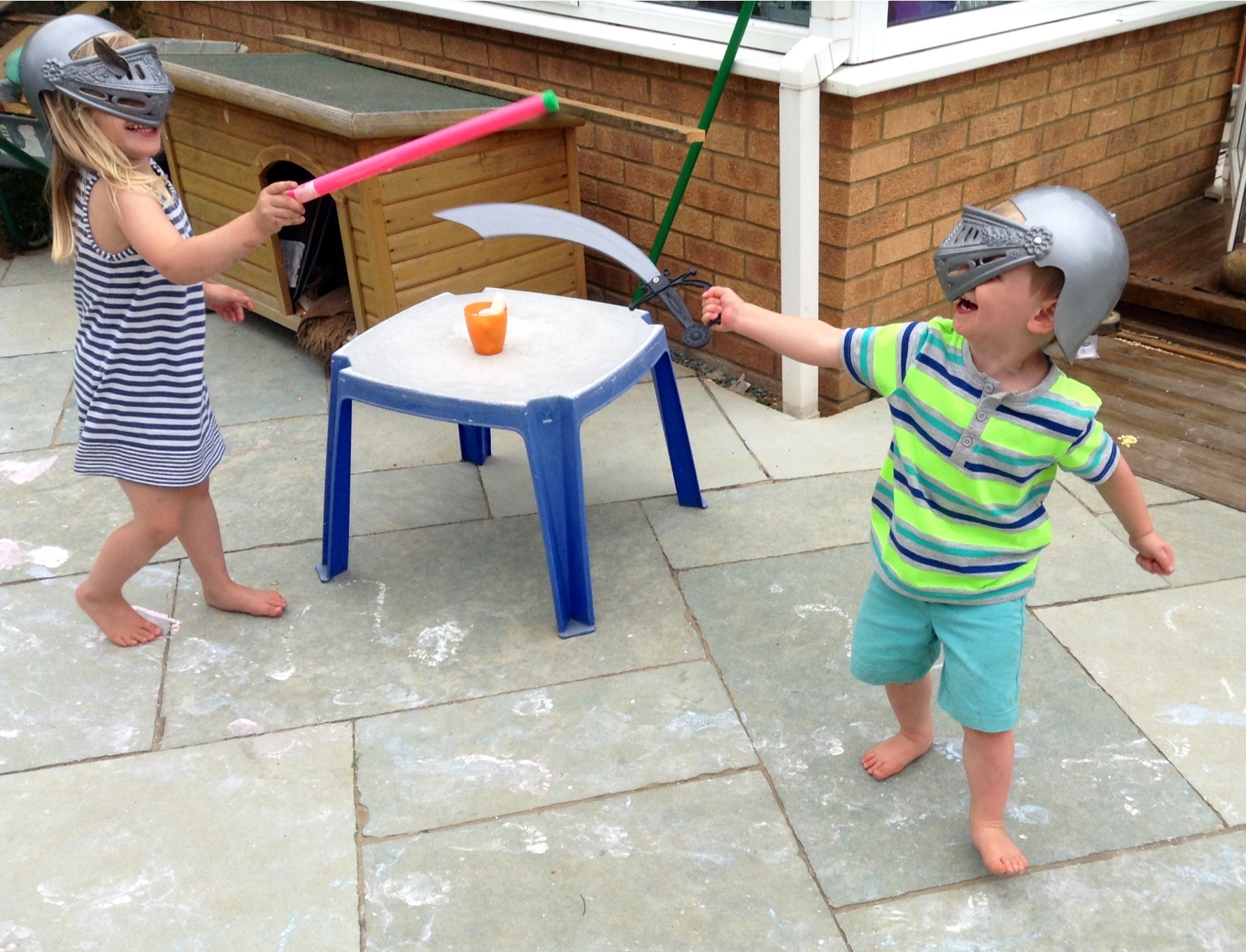 My attempt to change their focus ended up in a game of knights and swords – the children love Mike the Knight (on Cbeebies: I think he’s a selfish, whining brat). I thought that would be safer than running around with a three-foot stick, as the ‘swords’ were light plastic and they were wearing their knights’ helmets.